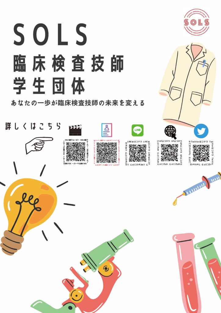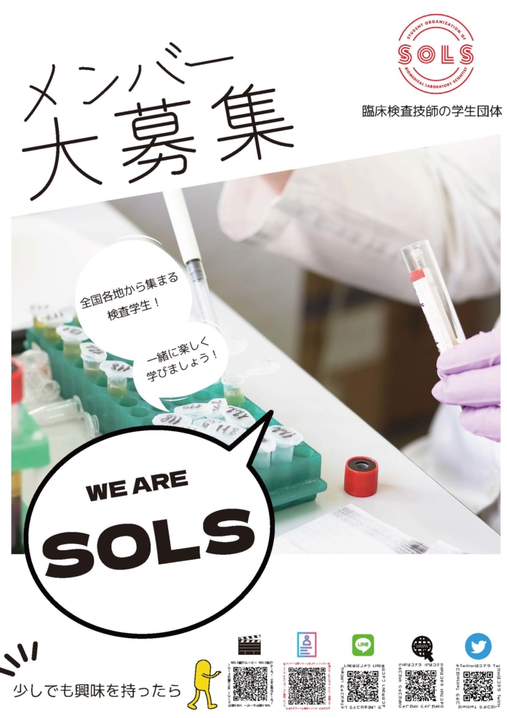 SOLSは、Student Organization of biomedical Laboratory Scientistの略称で、SOLには太陽という意味があるようです。目標に向けて突き進み、輝ける未来を創るという想いが込められています。